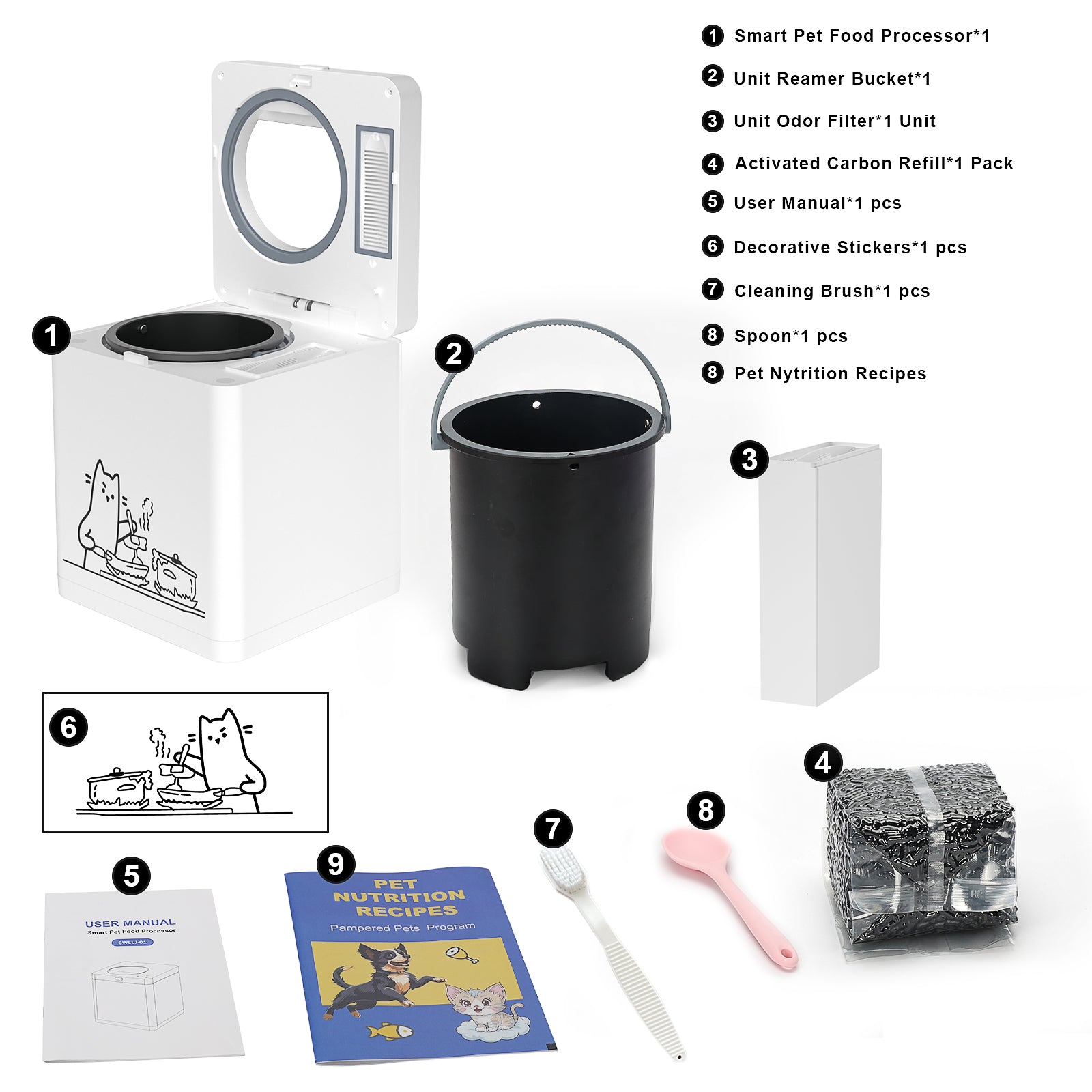 - Complete Accessory Set – Includes Pet Food Processor,Pet Menu, odor filter, cleaning brush, spoon, decorative stickers, and user manual. Create nutritious, homemade pet food with ease!
